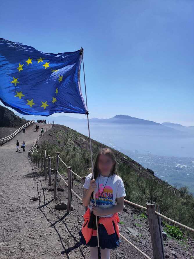 A young Derby tourist carries the EU Flag to Italy’s famous volcano.